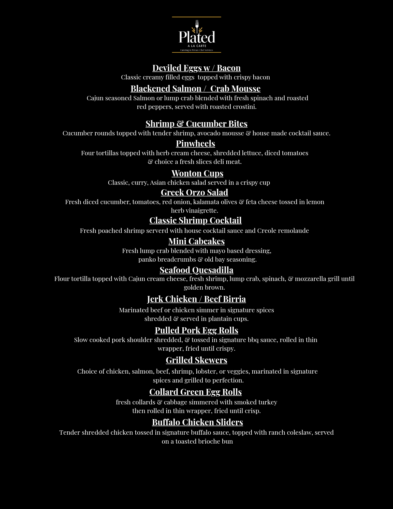 Our full service menu is designed for those seeking premium offerings, and stunning presentations. Unlike our A La Carte menu, this experience features custom table decor and a full buffet setup, including chafing dishes, drink stations, and tasting platters. Perfect for micro weddings, corporate events, and private gatherings of 25+ guests.
