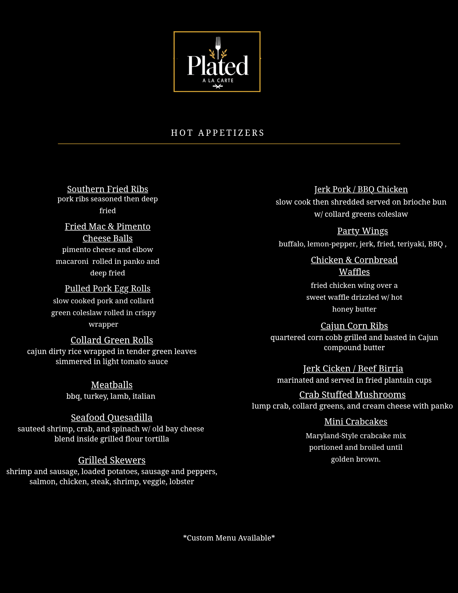 Our Hot Appetizers Are Crafted To Deliver Depth, And Both Flavor In Every Bite. Thoughtfully Prepared And Served Fresh, These Selections Combine Elements With Refined Presentation Ideal For Gatherings Where Rich Flavor And Elevated Execution Take Center Stage.