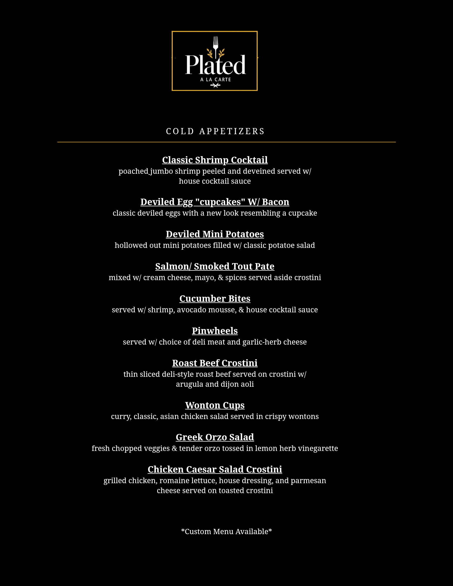 From Elegant Cocktail Hours To Private Celebrations, Our Appetizer Selections Are Designed To Welcome Guests With Intention And Style. Each Offering Blends Comfort, Creativity, And Elevated Flavors. Perfectly Portioned And Beautifully Presented To Complement Your Event.